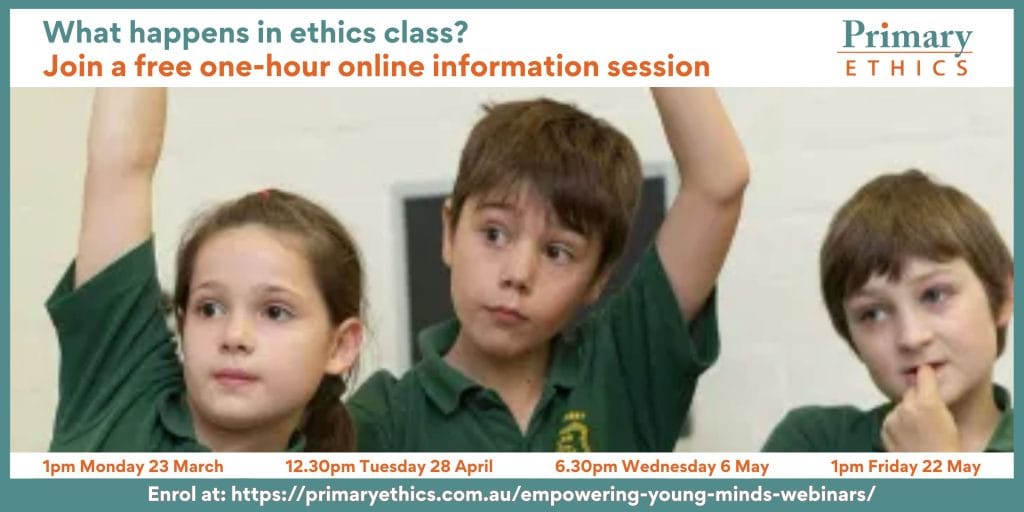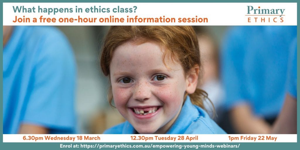 Active ethics teachers can enrol via Resources for ethics teachers in the Document Library. Recordings are not available, but topics will be repeated regularly. Contact Emily Zytaruk on training@primaryethics.com.au for more details or to request a future workshop.